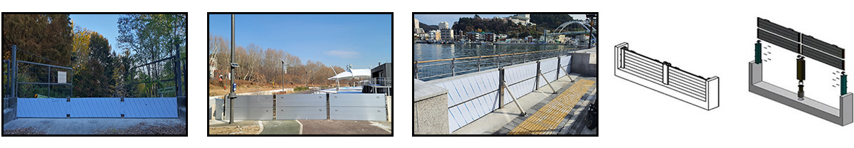 교량/하천 차수판은 집중폭우 시 제방 및 하천 범람을 막기 위한 차수판으로기존 차수판보다 두께 및 보강이 우수하며, 교량 및 차도에 설치가 가능하여 탁월한 침수 방지용 차수판, 차도 및 교량에 설치식 지주 틀을 사용하여 차량 이동시 비고정지주가 걸리지 않고 미관상 눈에 띄지 않음. 활용범위 : 하천, 교량 공동주택, 차도 인근, 침수가 잦은 제방 주변 등.